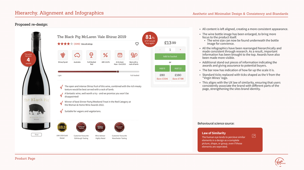 Using a problem/opportunity - example - solution - proposed redesign approach, I focused on the small details and made changes that reinforced the brand identity making it look even more like Virgin Wines. I supported my decisions with my initial research, behavioural science and UX laws.